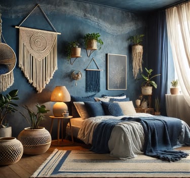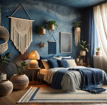 Walls: Deep indigo accent wall or wallpaper with a celestial theme.