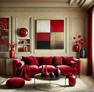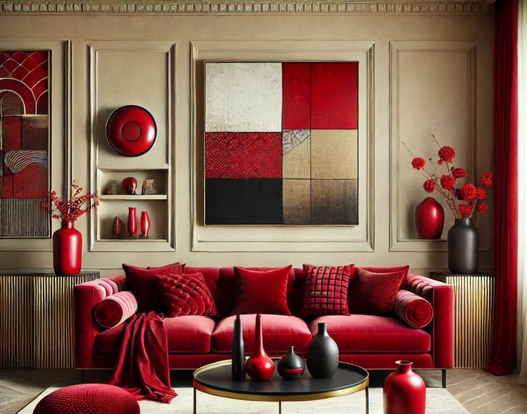Décor: Red ceramic vases, abstract art featuring bold reds, and patterned throw pillows.