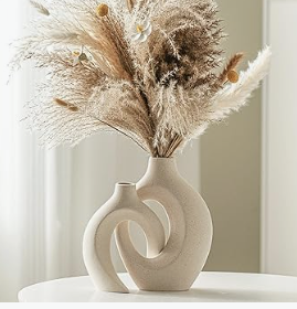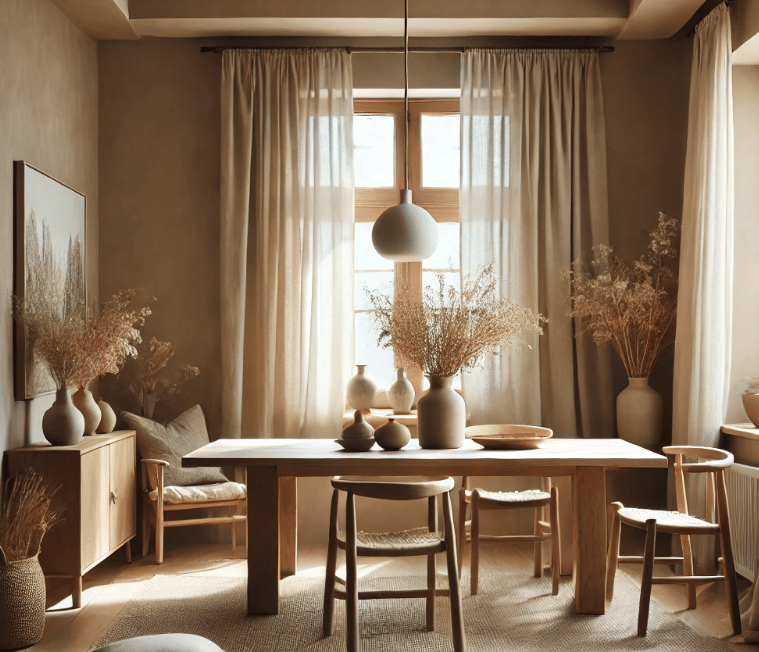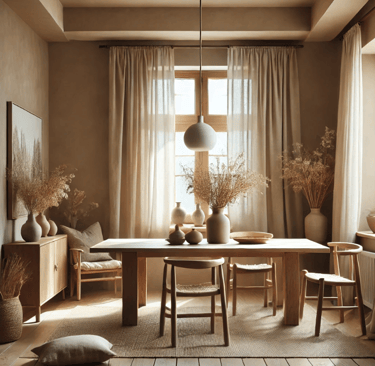 Décor: White ceramic vases, textured linen table runners, and soft beige drapes.