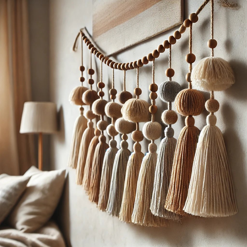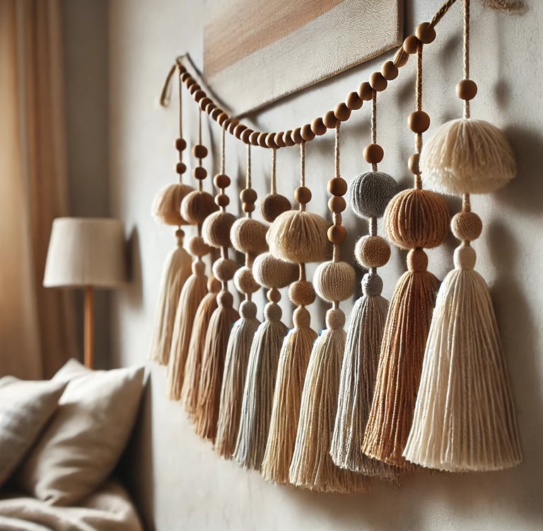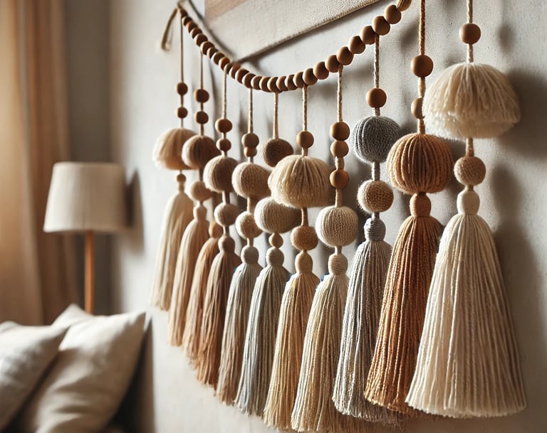 String the Tassels: Thread them onto twine, spacing them evenly. Add wooden beads for extra charm.